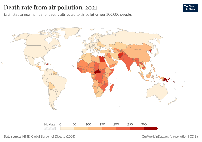 In the interactive map, we show death rates from air pollution across the world, measured as the number of deaths per 100,000 people in a given country or region.