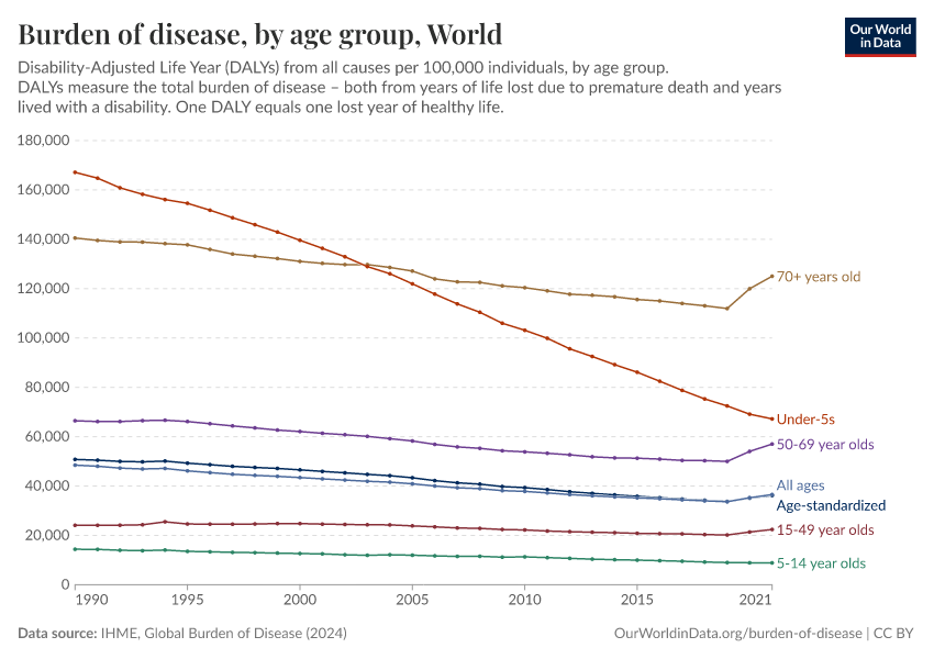 As you can see, rates of disease burden remain highest among the youngest and oldest in society. They have, however, seen the most notable declines in recent decades.