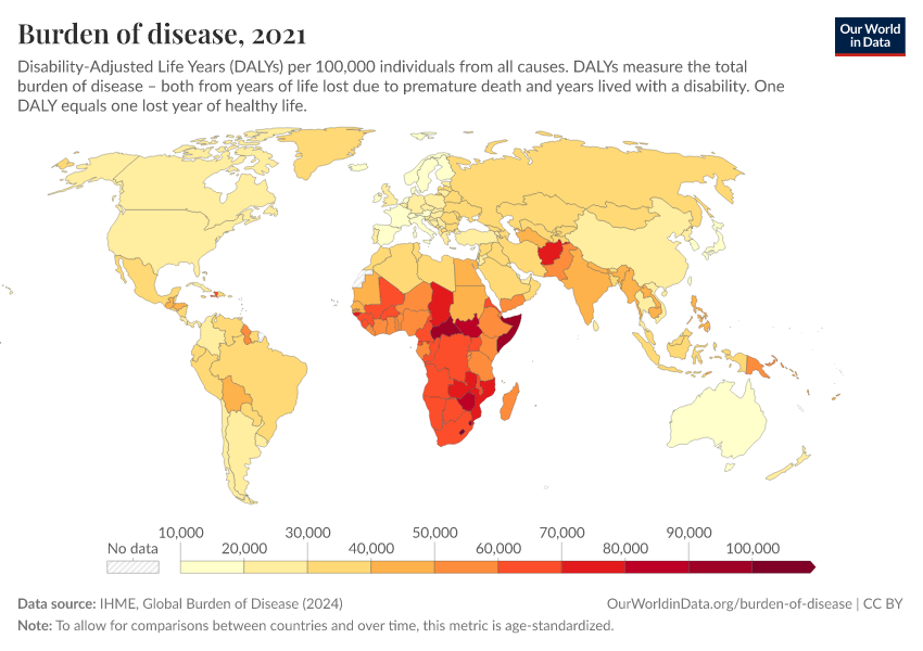 This map shows the annual rate of DALYs per 100,000 people in the population. It is thereby measuring the distribution of the burden of both mortality and morbidity around the world.