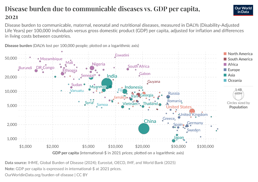 The burden of disease due to communicable diseases vs GDP per capita is shown in the following charts.