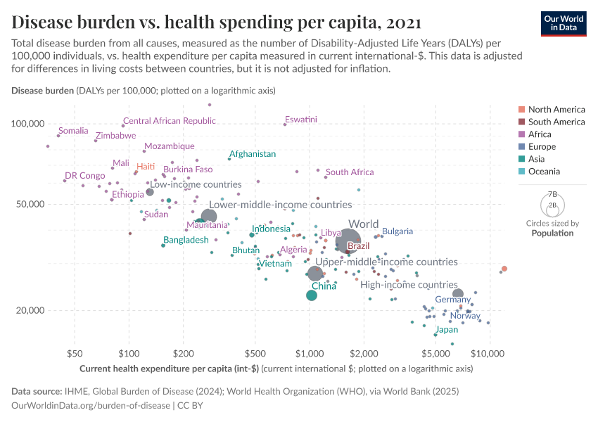 The chart below shows the relationship between the total burden of disease versus average health expenditure per person, measured in US dollars.
