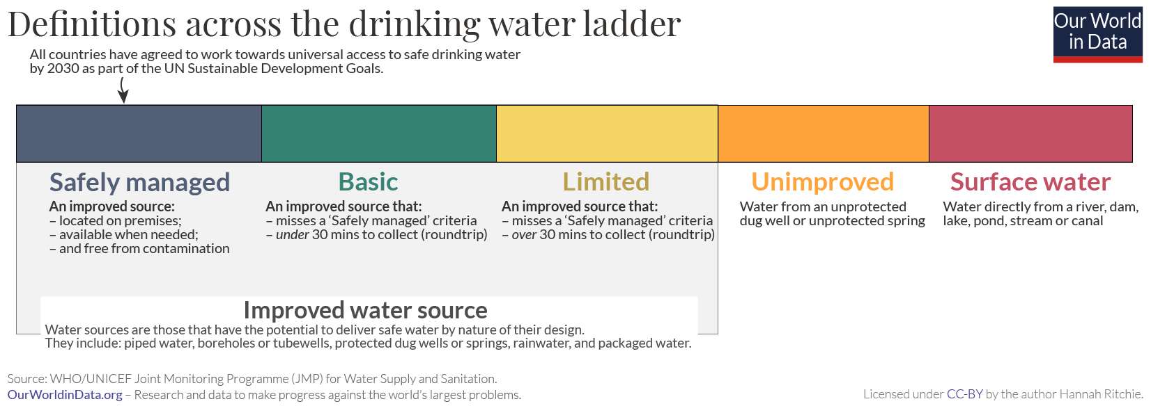 Improved water source: "Improved drinking water sources can deliver safe water by nature of their design and construction, and include: piped water, boreholes or tube wells, protected dug wells, protected springs, rainwater, and packaged or delivered water".