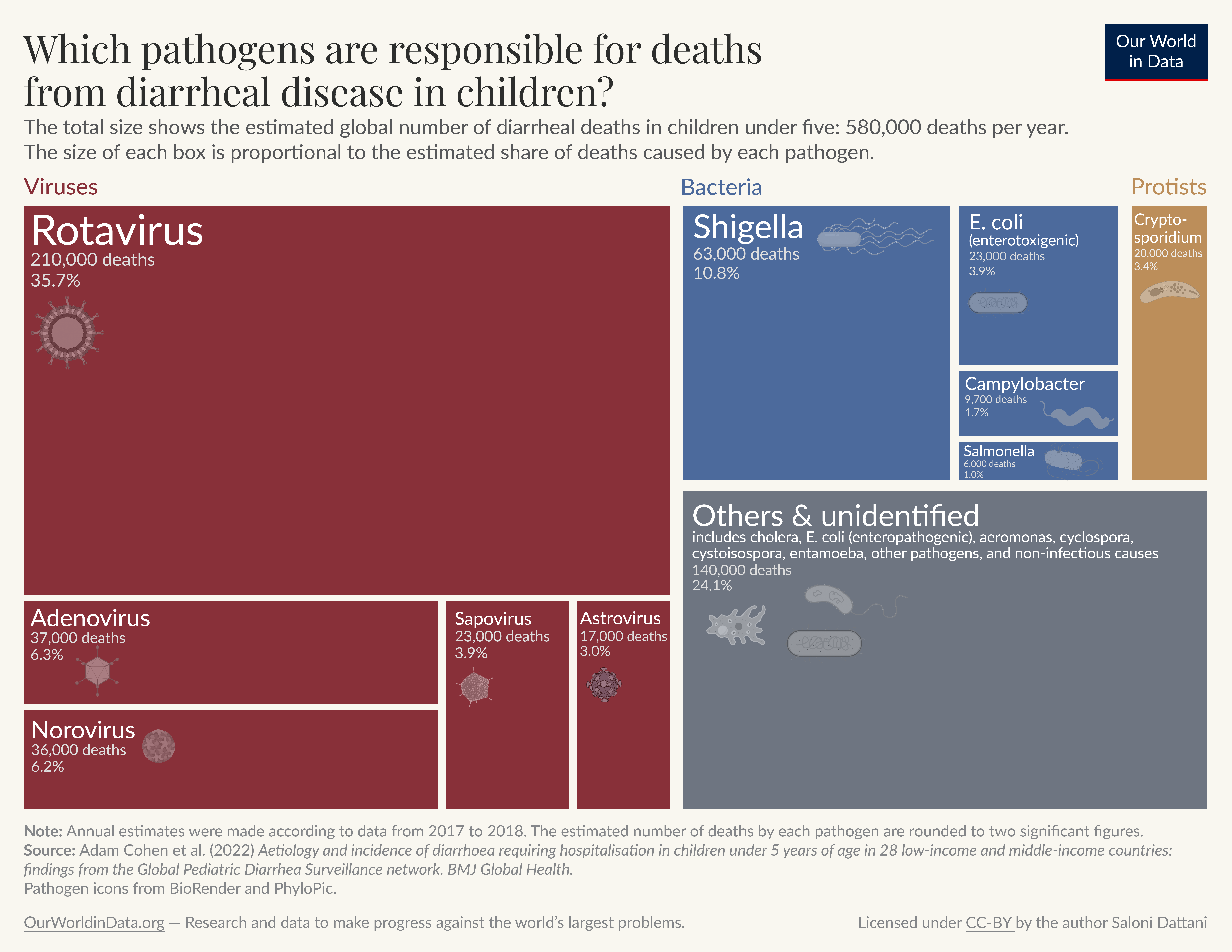 This page shows estimates of diarrheal death rates worldwide and the pathogens that cause them. We also offer data on access to public health measures and how they have changed.