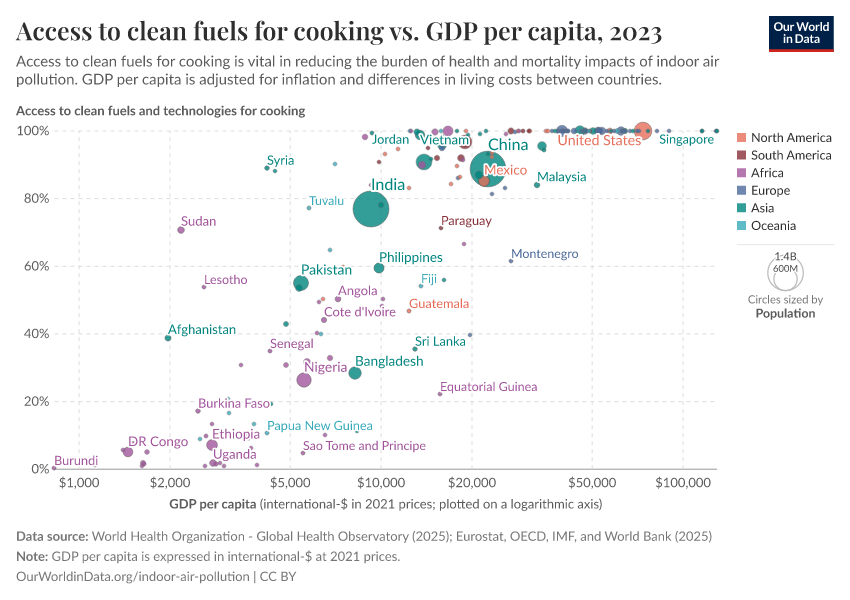 The availability (and affordability) of electricity and clean fuels for cooking is strongly related to income. Poor energy access is strongly tied to having a low income.