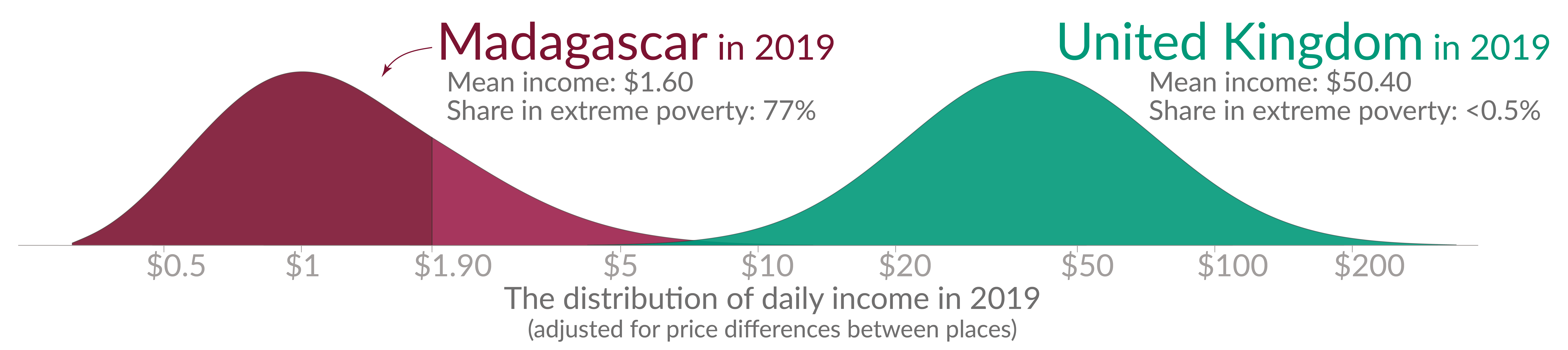 If we’d only rely on the poverty line from high-income countries, we would hide the differences between people with very different living standards. Whether someone was living on almost $30 a day or on thirty times less would not matter – they would all be considered ‘poor’.