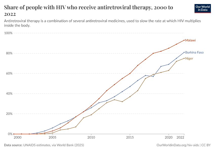 In the chart below, you can see the rise in the share of people with HIV who receive antiretroviral therapy, a lifesaving intervention against HIV/AIDS.