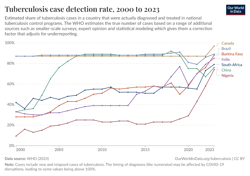 In the chart below, you can see rises in detection rates for tuberculosis in different countries. This is again helped by efforts such as The Global Fund and PEPFAR.