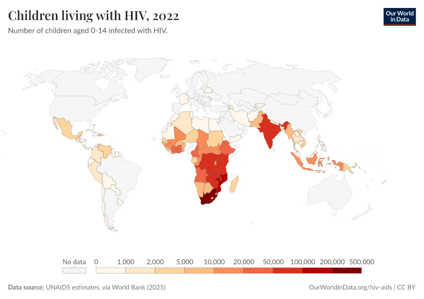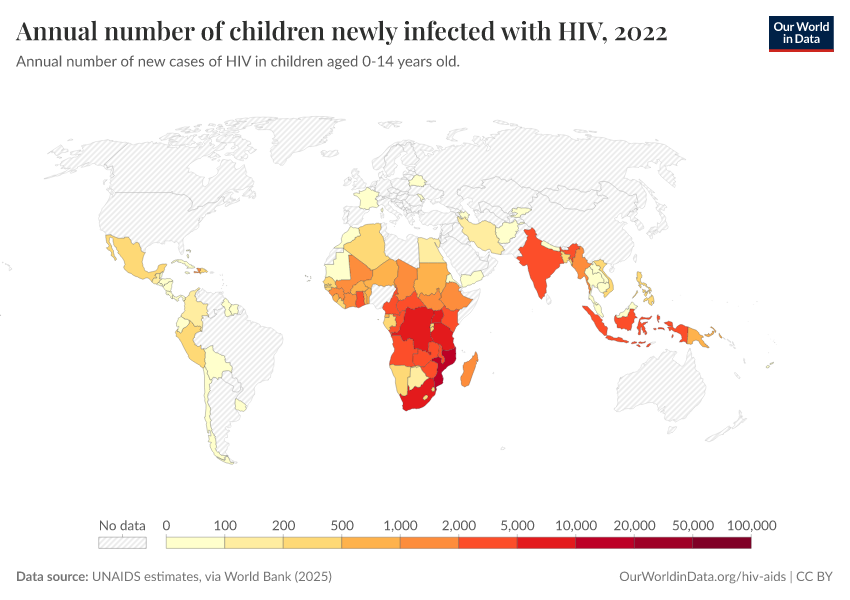 The map shows the total number of children newly infected with HIV yearly. Globally — with similar trends at national levels — the number of new infections in children peaked around the early 2000s (with over 500,000 new infections per year globally), followed by a rapid decline over the last decade.