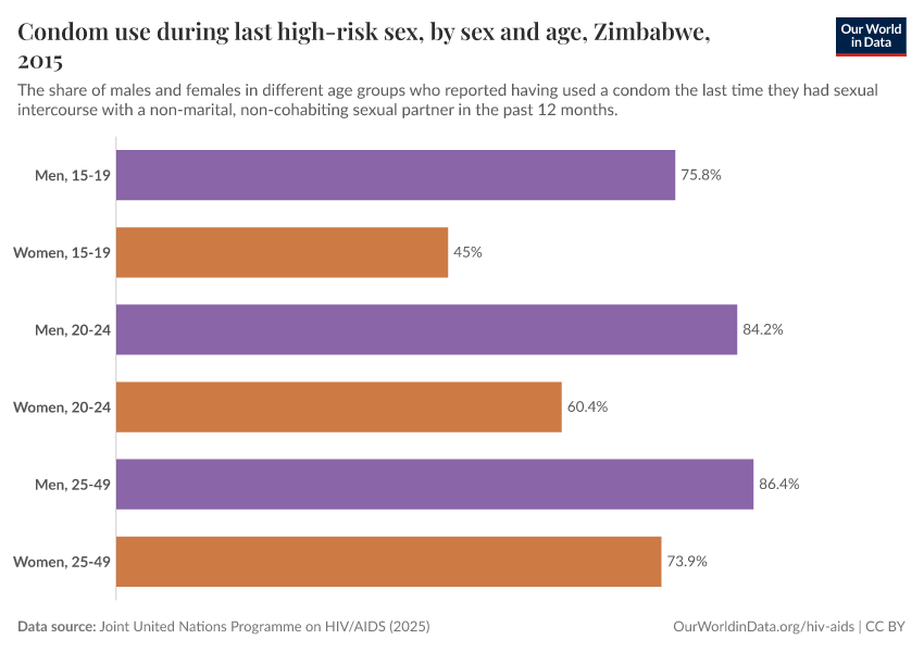 Sexual transmission can be prevented through condom use (both in heterosexual and homosexual relationships). In the charts here, we see the prevalence of condom use, particularly in cases of “high-risk sex”, which is defined by this data’s source as non-marital, non-cohabiting sexual partner.