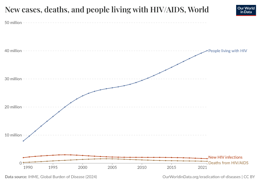 The chart also shows the continuing increase in the number of people living with HIV. The growth rate has slowed compared to the 1990s, but the absolute number is at the highest ever.
