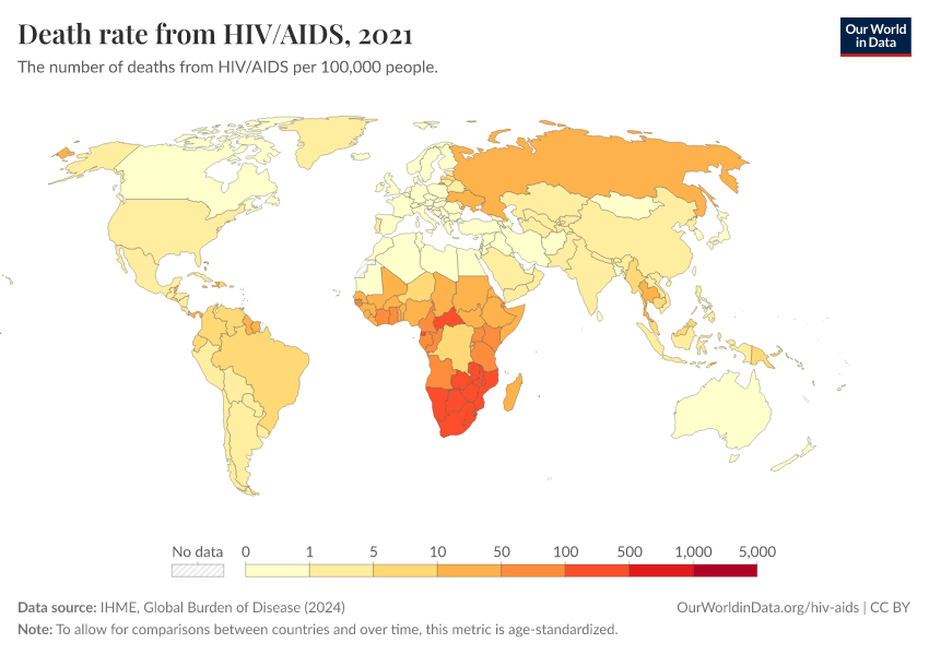 The significant health burden of HIV/AIDS across Sub-Saharan Africa is also reflected in death rates. Death rates measure the number of deaths from HIV/AIDS per 100,000 individuals in a country or region.