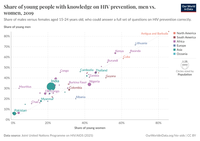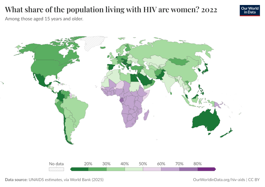 There are differences in the prevalence of HIV and death rates from AIDS between men and women. The chart shows the share of women in populations living with HIV.