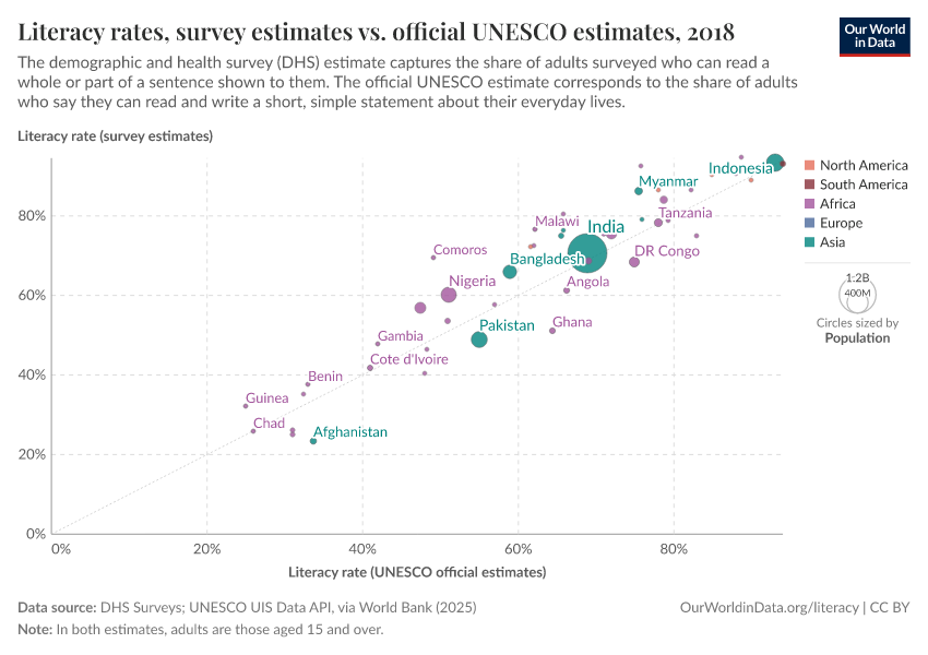 Esteban Ortiz-Ospina and Diana Beltekian (2018) - “How is literacy measured?” Published online at OurWorldinData.org. Retrieved from: 'https://archive.ourworldindata.org/20260119-070102/how-is-literacy-measured.html' [Online Resource] (archived on January 19, 2026).BibTeX citation