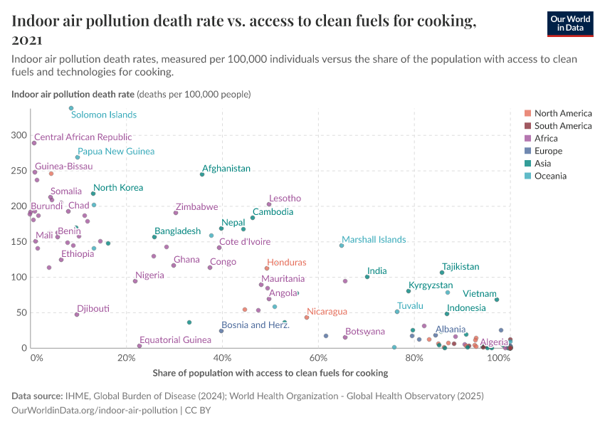 Low-income households tend to rely on solid fuels for cooking because cleaner fuels are either unavailable or too expensive. We, therefore, see a strong link between death rates from indoor air pollution and access to clean fuels for cooking.