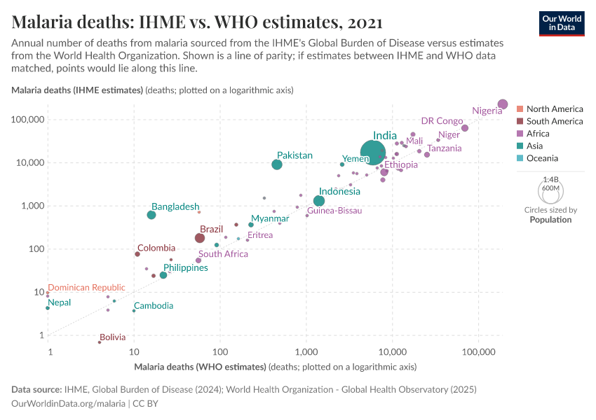 These estimates are notably higher than those of the WHO. Although divergent on the total number of malaria deaths, both the IHME and WHO estimate that the vast majority of deaths are in the African region.
