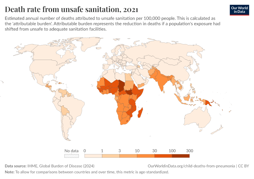 In this map, we see death rates from unsafe sanitation across the world. Death rates measure the number of deaths per 100,000 people in a given country or region.