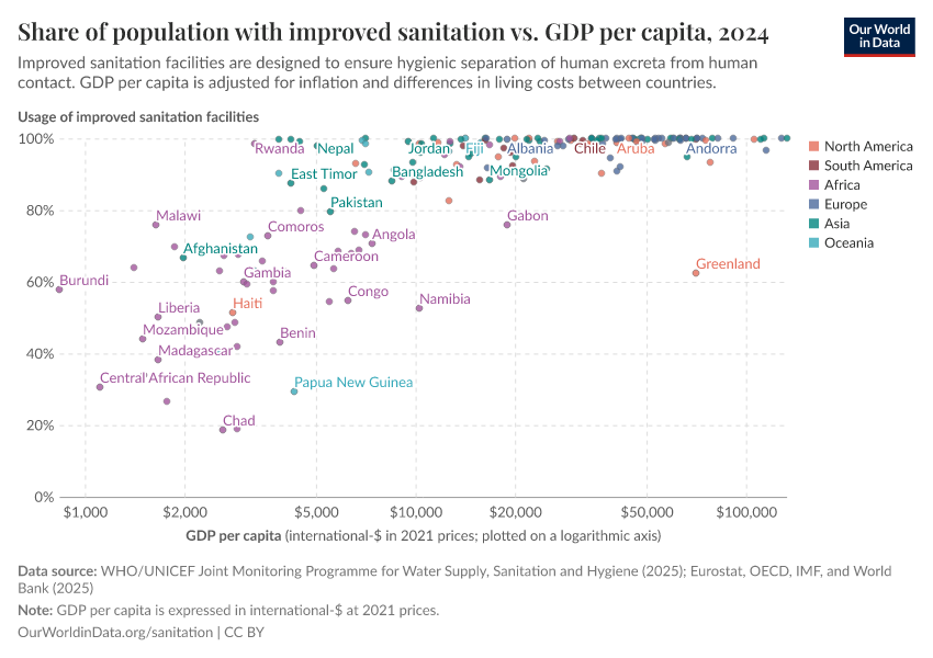 The provision of better sanitation facilities tends to increase with income. In the chart, we see the share of the population using improved sanitation versus gross domestic product (GDP) per capita.