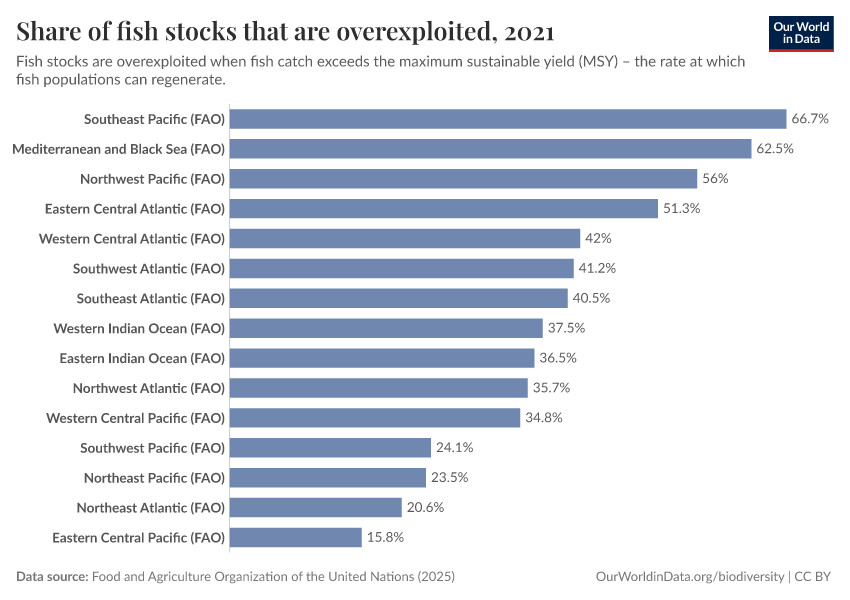 “Data Page: Share of fish stocks that are overexploited”, part of the following publication: Hannah Ritchie, Pablo Rosado, and Max Roser (2023) - “Agricultural Production”. Data adapted from Food and Agriculture Organization of the United Nations. Retrieved from https://archive.ourworldindata.org/20251204-144539/grapher/share-of-fish-stocks-overexploited.html [online resource] (archived on December 4, 2025).How to cite this data