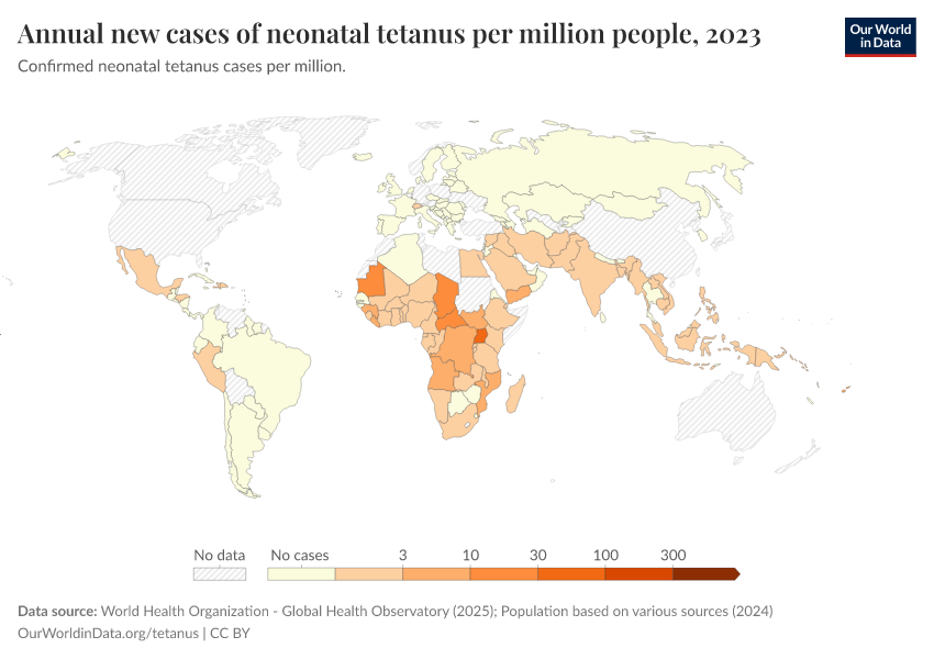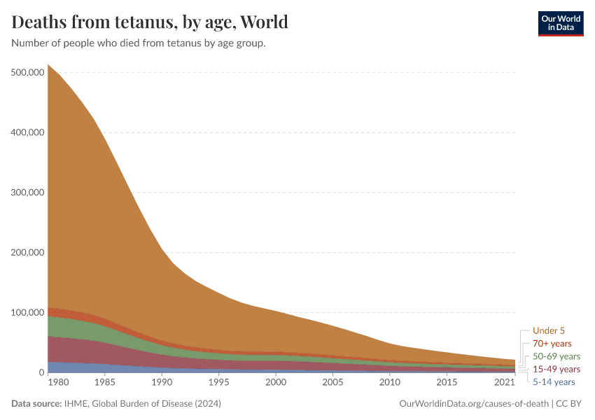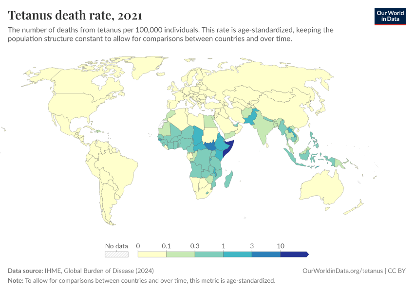 Hannah Behrens, Sophie Ochmann, Bernadeta Dadonaite, and Max Roser (2019) - “Tetanus” Published online at OurWorldinData.org. Retrieved from: 'https://ourworldindata.org/tetanus' [Online Resource]BibTeX citation