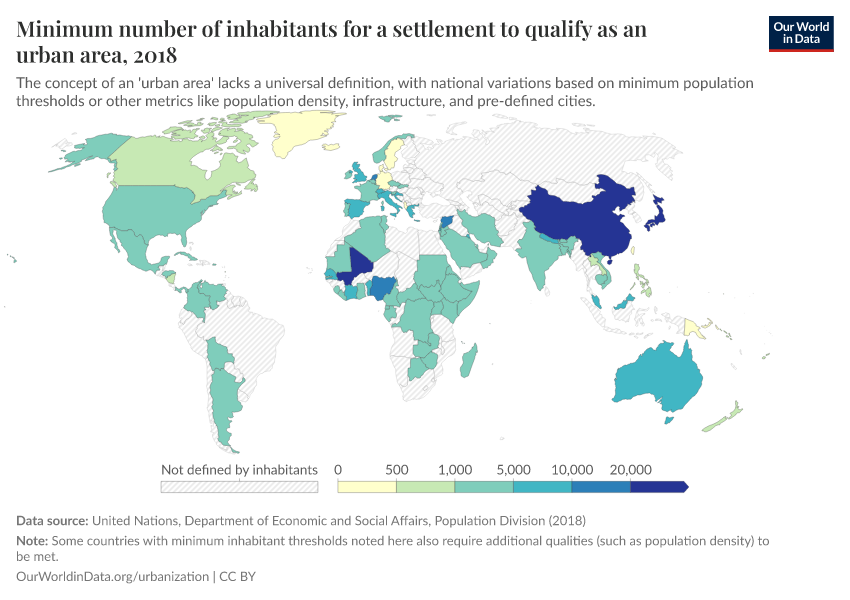 There is currently no universal definition of what 'urban' means. The UN reports figures based on nationally defined urban shares. The problem, however, is that countries adopt very different definitions of urbanization. Not only do the thresholds of urban versus rural vary, but the types of metrics used also differ. Some countries use minimum population thresholds, others use population density, infrastructure development, employment type, or simply the population of pre-defined cities.
