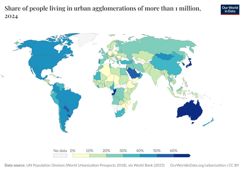 Although the definition of 'urban' gives us some indication of population densities, it does not differentiate between those who live in small versus large urban settings. In the chart, we show the percentage of the total population that lives in agglomerations greater than one million people (i.e. large urban agglomerations). These figures are available in absolute terms (the total number of people living in large urban settings), found here.