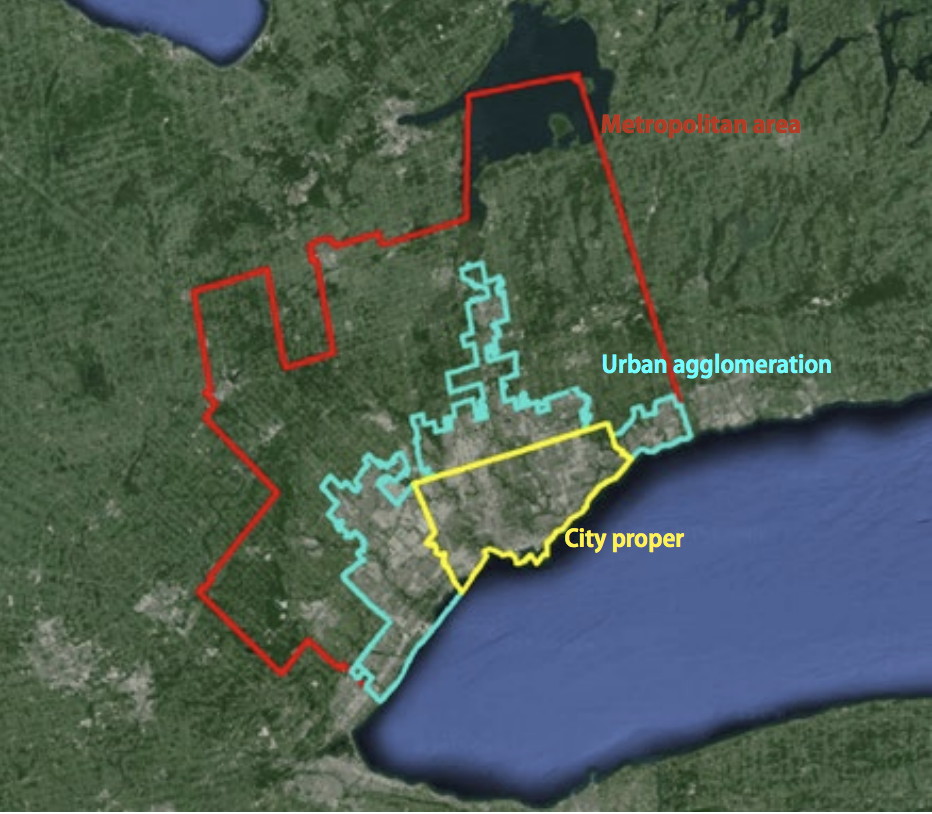 This figure, which shows the urban definition boundaries for Toronto, is used by the UN to demonstrate these differences.17