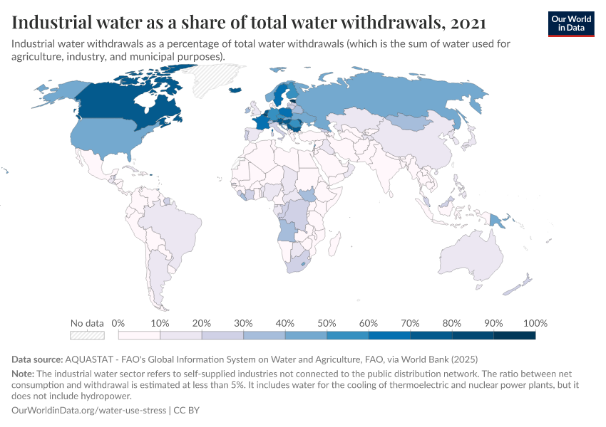 The visualization provides an overview of industrial water withdrawals measured as the share of total water withdrawals (which is the sum of agricultural, industrial, and domestic uses).