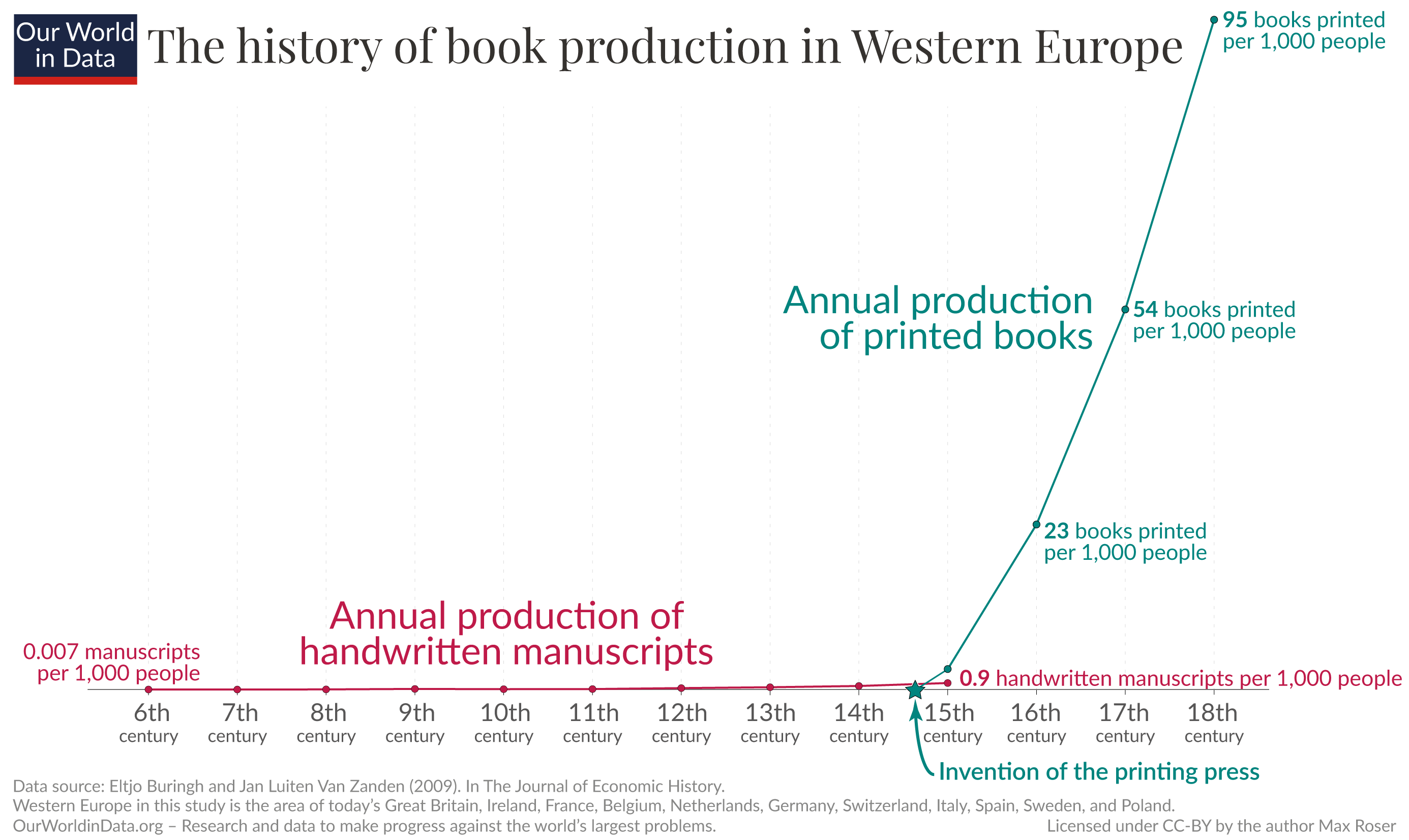 It is no accident that the shape of this chart is very similar to the chart on book production at the beginning of this text — very low and almost flat for many generations and then quickly rising. Both of these developments are driven by changes in production.